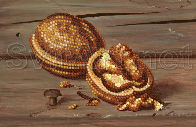 Schemă pentru broderie cu margele pe gabardină și satin "Nuci pe masă". Un nuc întreg și un fund deschis pe o masă de lemn.