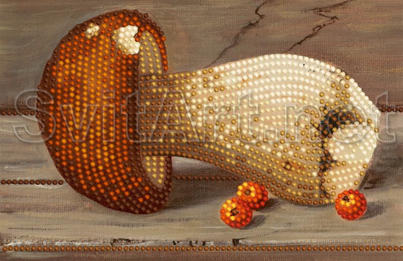 Informaţii suplimentare: Schemă pentru broderie cu margele pe gabardină și satin "Ciuperca albă pe masă". O ciupercă albă frumoasă și mai multe fructe de pădure de cenușă se află pe o masă de lemn.
