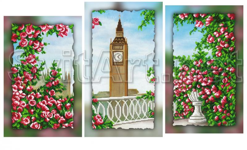 Big BenMagnit pentru brodarea cu margele pe triptych modular de panza "Big Ben". Vedere minunată prin flori către faimosul Big Ben.