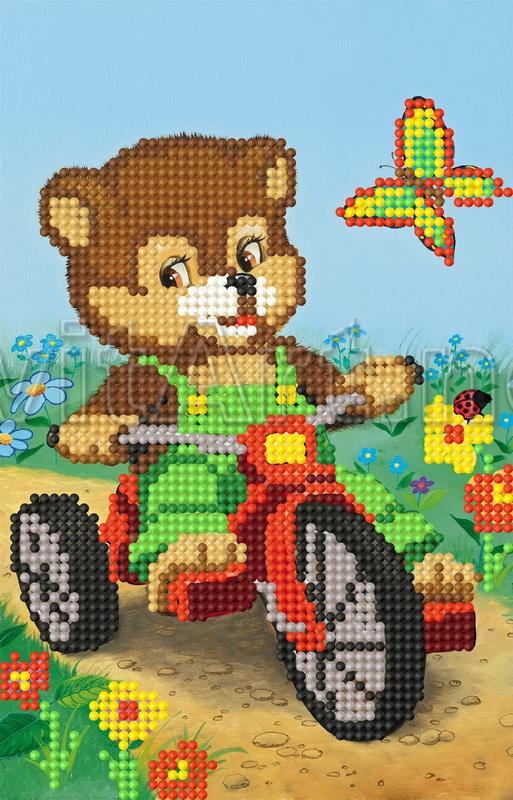 Доп. информация: Схема для вышивки бисером на габардине и атласе "Медвежонок на велосипеде". Мультяшный медвежонок едет на велосипеде по дорожке, рядом летает бабочка.