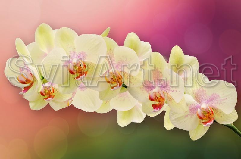 Доп. информация: Холст безрамный "Веточка желтой орхидеи на цветном фоне". Нежные цветки желтой орхидеи на зеленом стебле.