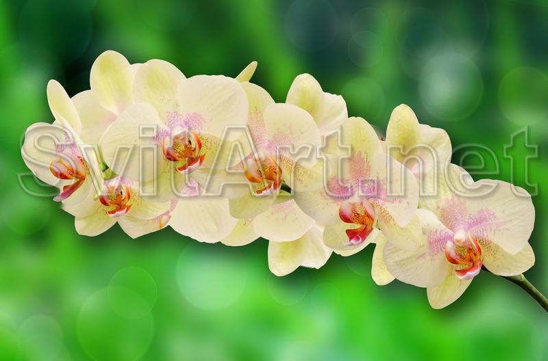 Доп. информация: Холст безрамный "Веточка желтой орхидеи на фоне травы". Нежные цветки желтой орхидеи на зеленом стебле.