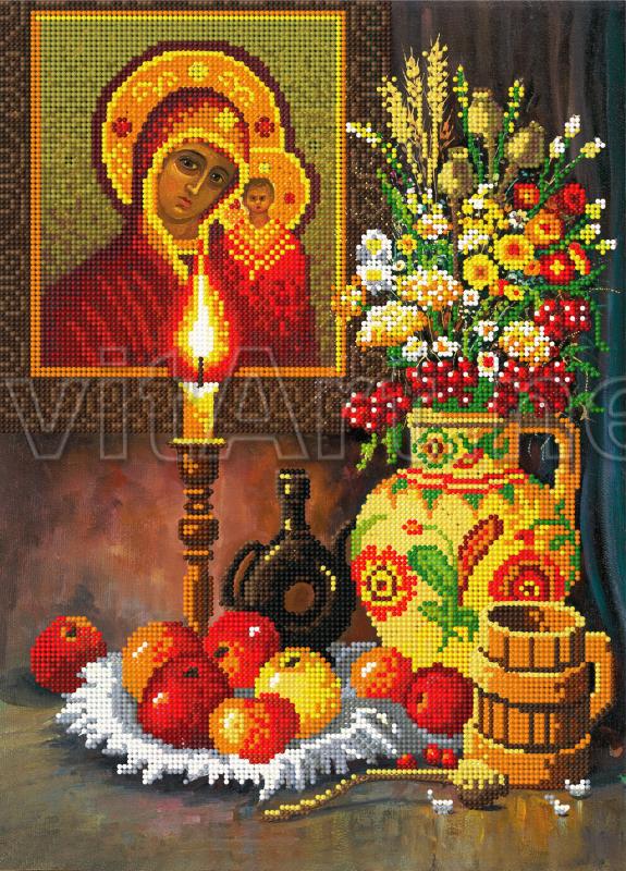 Доп. информация: Схема для вышивки бисером на габардине и атласе: Икона с Богородицей на стене, горящая свеча, яблока на столе, ваза с цветами. Религия - икона
