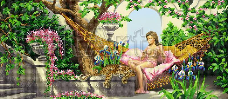 Доп. информация: Схема для вышивки бисером на габардине и атласе: Девушка с леопардом на гамаке, женщина на гамаке в саду. Люди - Женщина с леопардом