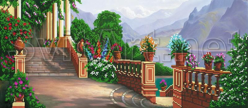 Доп. информация: схемы для вышивки бисером на габардине и атласе,Вилла в горах, ухоженый двор, цветы,забор,кусты,горы