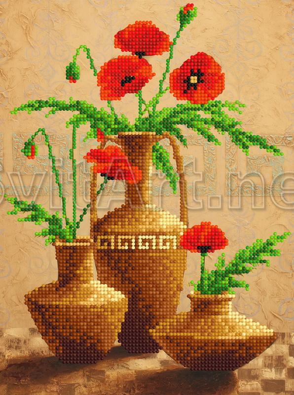 Доп. информация: Схема для вышивки бисером на габардине и атласе: Красные маки в разных сосудах, пять красных маков смотрят друг на друга. Цветы - цветущие маки в глиняных вазах