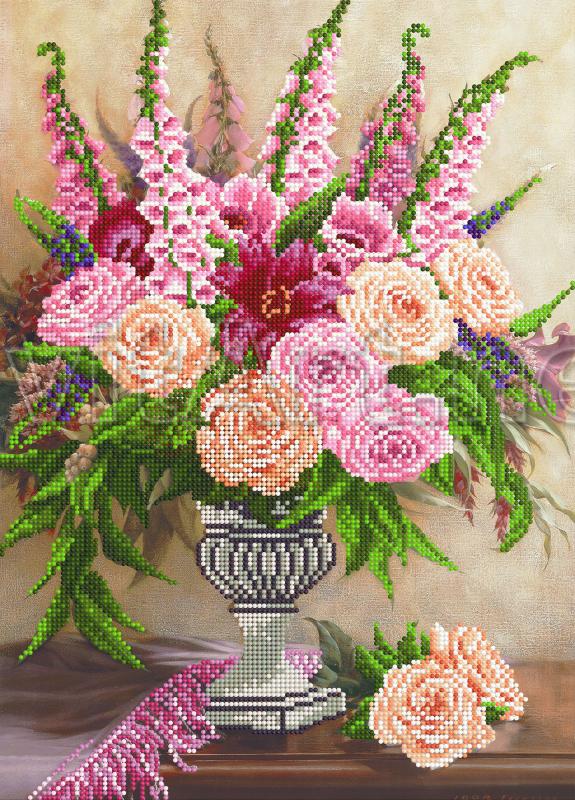 Доп. информация: схемы для вышивки бисером на габардине и атласе Ваза с цветами на столе, розы в вазе, зелень и цветы
