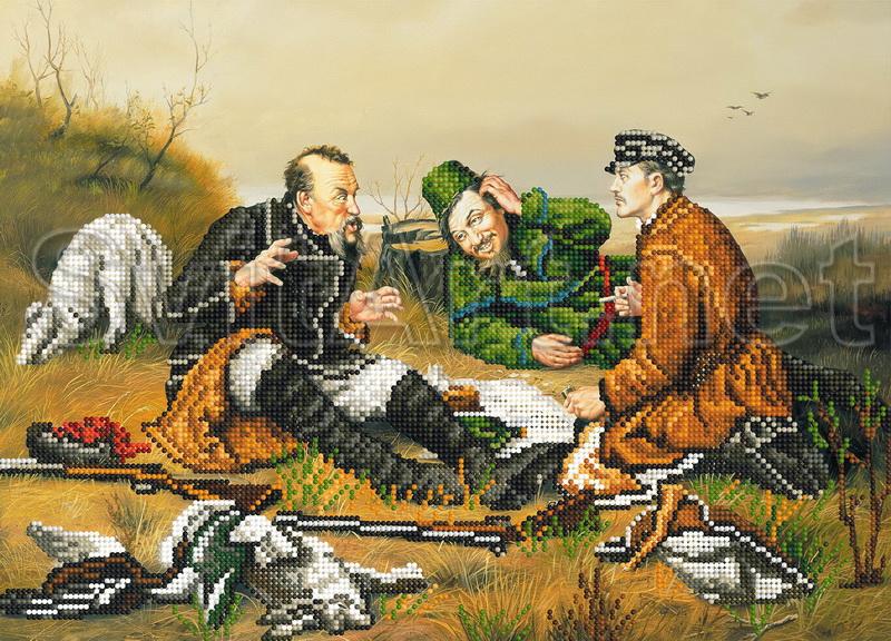 Доп. информация: схемы для вышивки бисером на габардине и атласе Три охотника на отдыхе, люди и собака,отдых после охоты
