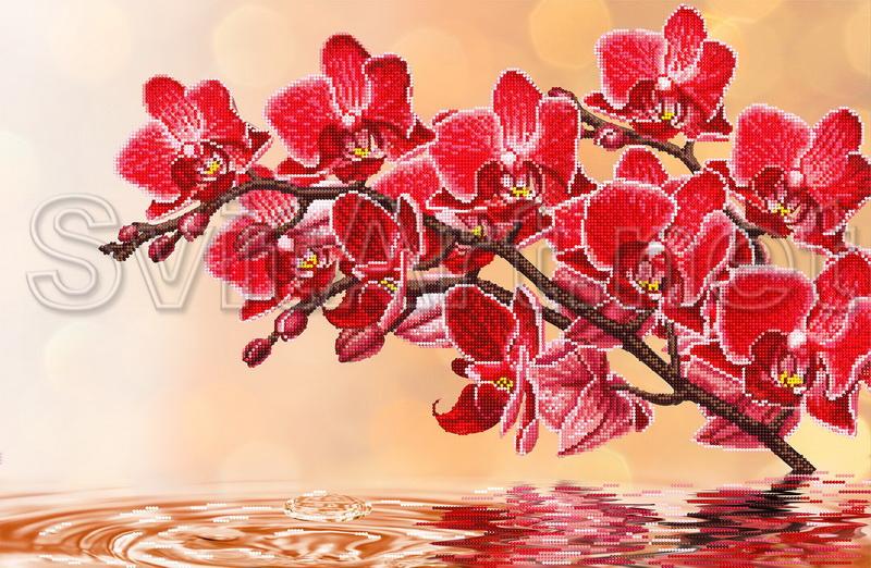Доп. информация: Схема для вышивки бисером на габардине А2 (38х58) "Красная ветка орхидеи". Ветка с красными цветами орхидеи на оранжевом фоне.