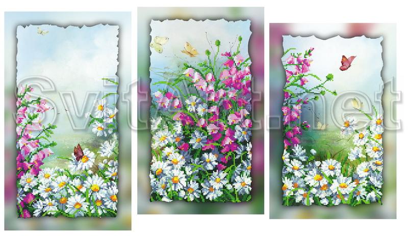 Доп. информация: Магнит для вышивания бисером на холсте модульный триптих "Лиловые кусты и белые цветы". Поляна с белыми цветами на которой растет куст с лиловым цветом.