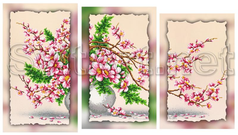 Доп. информация: Магнит для вышивания бисером на холсте модульный триптих "Ваза с розовой магнолией". Белая округлая ваза с большим кустом магнолии и зеленых веток.