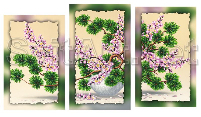 Доп. информация: Магнит для вышивания бисером на холсте модульный триптих "Розовые цветы и хвоя". Округлая белая ваза с длинными ветками розового цвета и хвойного дерева.
