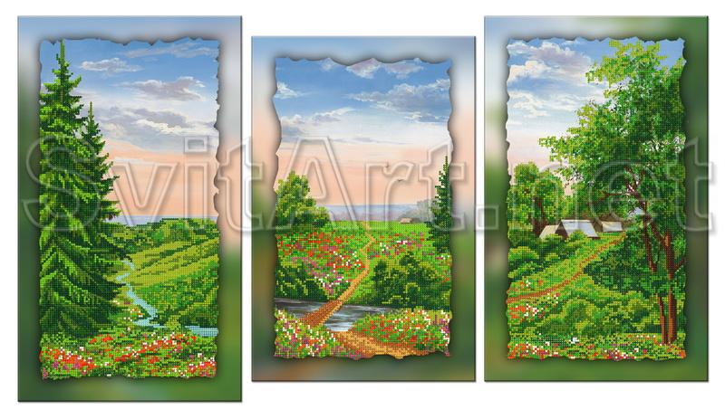 Доп. информация: Магнит для вышивания бисером на холсте модульный триптих "Дорога через поле". Грунтовая дорога выходит из леса и ведет через открытое поле травы.