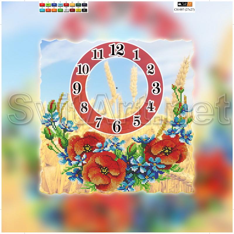 Доп. информация: Магнит для вышивания бисером на холсте "Коричневые часы на фоне поля". Коричневые часы с цветами маков и васильков на фоне пшеничного поля.
