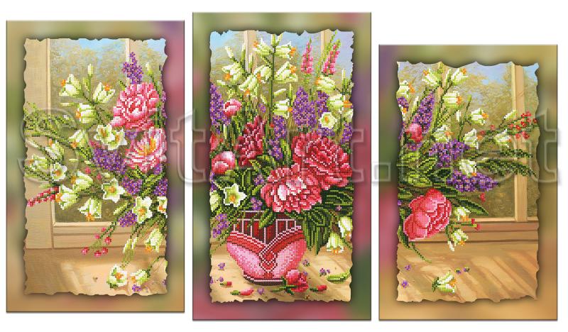 Доп. информация: Магнит для вышивания бисером на холсте модульный триптих "Розовая ваза с цветами". Огромное количество белых, розовых и красных цветов в компактной розовой вазе.