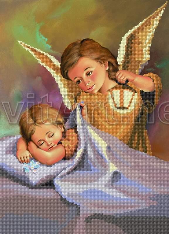 Дод. інформація: Схема для вишивки бісером на габардині і атласі: Ангел хранитель з світильником біля дитини, охоронець сну, ангел і дитина. Релігія - ангел з дитиною