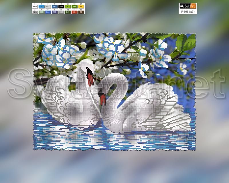 Дод. інформація: Магніт для вишивання бісером на полотні "Пара білих лебедів на воді". Пара чудових білих птахів пливе по воді на тлі зелені і блакитних квітів.