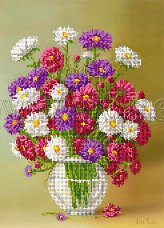 Дод. інформація: Схема для вишивки бісером на габардині і атласі: Букет красивих різнобарвних ромашок, різнокольорові ромашки у вазі. Квіти - ромашки у вазі з водою
