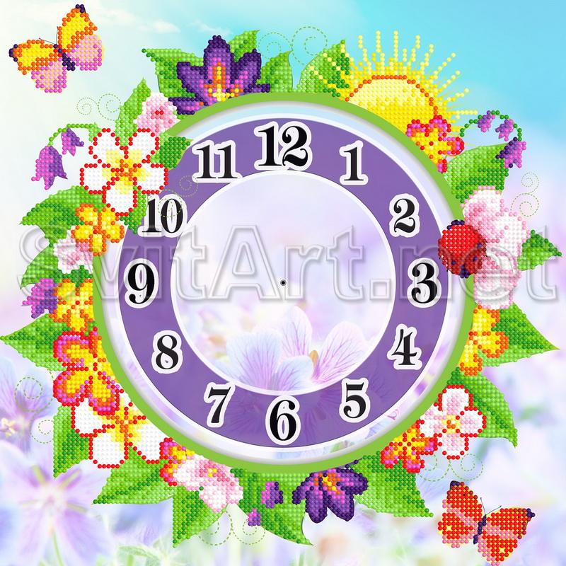 Дод. інформація: Схема для вишивки бісером на габардині і атласі: Фіолетові годинник з квітами і метеликами, що літають метелики біля годинника. Квіти - годинник з квітами метеликом і сонцем